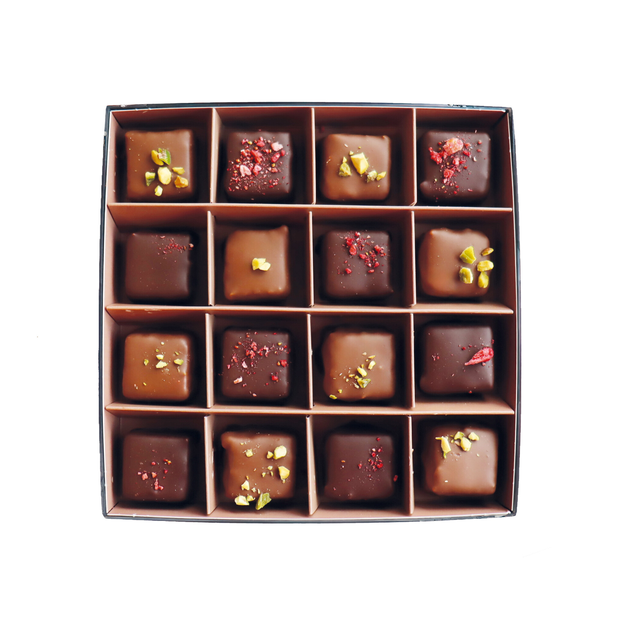 Donkere chocoladecouverture (cacaomassa, suiker, cacaoboter, emulgator: E322 (SOJA); natuurlijk vanille aroma), Suiker, PISTACHE praline (glucosestroop, invertsuikerstroop, AMANDELpasta, 5% PISTACHEpasta, HAZELNOOTpasta, concentraten (wortel, spirulina), natuurlijk aroma), Witte chocolade (suiker, cacaoboter, volle MELKpoeder, emulgator: E322 (SOJA), natuurlijk vanille aroma), roomboter (MELK), Kadayif (TARWEbloem, Water, Zout), TARWEbloem, EI (scharrelei, conserveermiddel: E202), coating (suiker, plantaardig vet (kokosnoot, palmpit), 12% magere cacaopoeder, magere MELKpoeder, weipoeder (MELK), MELKsuiker, emulgator: E322 (SOJA), natuurlijk vanille aroma), EIgeel (scharrelEIgeel, voedingszuur: E330, conserveermiddel: E202), cacaopoeder (cacaopoeder, zuurteregelaar: E501i), gevriesdroogde aardbei, Rozenblad, vanillesuiker (suiker, aroma), zout (zout, kaliumjodide, antiklontermiddel (E535))